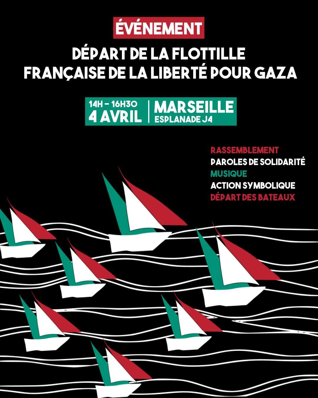 Ce samedi 4 avril, rendez-vous sur l'Esplanade J4 de Marseille à 14h pour participer au rassemblement de soutien et aux démonstrations de solidarité avec Gaza, avant le départ des bateaux de la campagne française de la Flottille de la Liberté pour Gaza et des Mille Madleens vers Gaza.