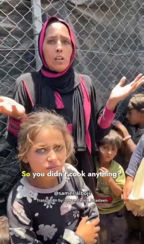 « C'est la famine. C'est une politique délibérée qu'ils expérimentent sur nous. C'est injuste et oppressif. » Une mère palestinienne fond en larmes, affirmant que le mécanisme d'aide américano-israélien actuel à Gaza ne fonctionne pas, notamment pour les familles comme la sienne, car elles doivent parcourir de longues distances à pied pour atteindre le centre de distribution d'aide le plus proche, sans aucune garantie de pouvoir obtenir quoi que ce soit, ni de rentrer chez elles après.