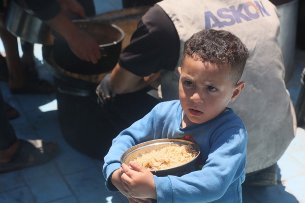 UN News. Un enfant de Gaza portant une assiette remplie de riz.