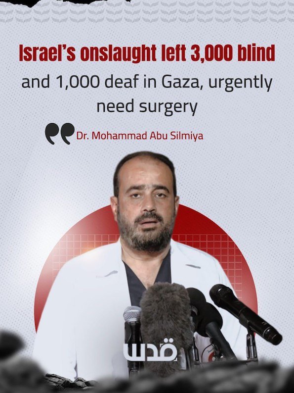 L'attaque génocidaire israélienne contre Gaza, qui a duré plus de 2 ans, a laissé 3 000 personnes aveugles et 1 000 sourdes sur le territoire, dont beaucoup ont besoin d'une intervention chirurgicale urgente, selon le Dr Mohammad Abu Silmiya, directeur du complexe médical Al-Shifa à Gaza.