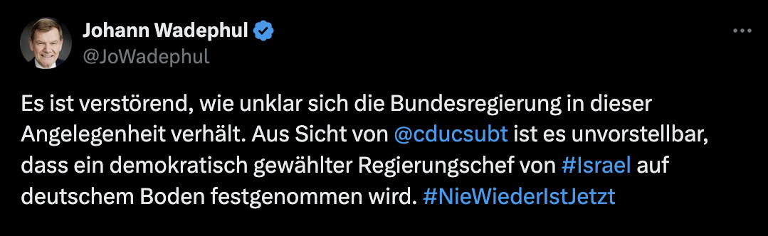 Germany's new foreign minister declaring it "unthinkable" that Netanyahu could be arrested in Germany - defying the authority of the ICC.