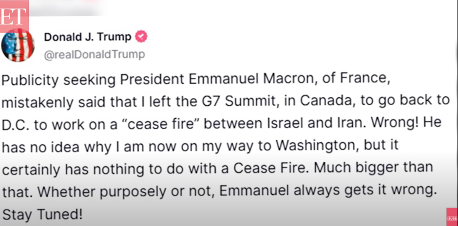 « Le président Emmanuel Macron, de France, pour se faire de la publicité, a dit par erreur que j'avais quitté le sommet du G7 au Canada pour retourner à Washington pour travailler à un cessez-le-feu entre Israël et l'Iran. Faux ! Il n'a aucune idée de la raison pour laquelle je suis maintenant en route pour Washington, mais cela n'a certainement rien à voir avec un cessez-le-feu. C'est beaucoup plus gros que ça«, a écrit Donald Trump sur son réseau Truth Social avant de conclure impitoyablement : « Volontairement ou pas, Emmanuel ne comprend jamais rien ! »