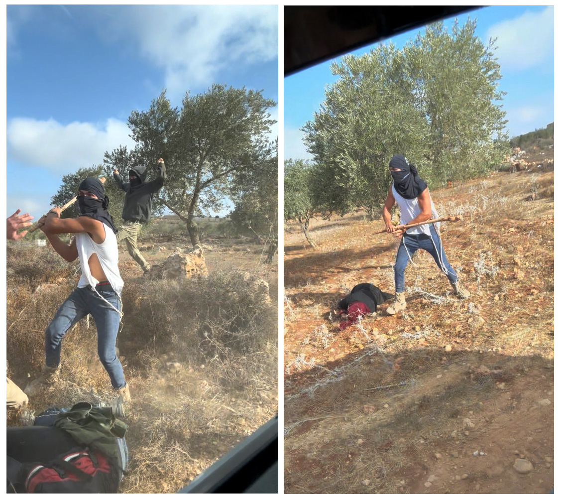 Un colon masqué frappe une femme âgée en train de récolter des olives au nord de Ramallah.  Le journaliste américain Jasper Nathaniel, qui a documenté l'agression, a déclaré que l'armée israélienne avait conduit les villageois dans « une embuscade brutale tendue par des colons armés ».