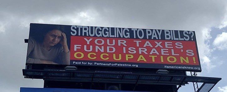 A Orlando en Floride, un grand panneau d'affichage près de l'aéroport indique : « Vous avez du mal à payer vos factures ? Vos impôts financent l'occupation israélienne. »