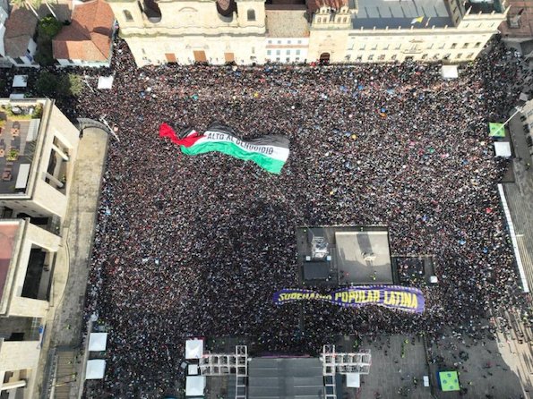 Immense drapeau palestinien Plaza de Bolívar pendant le concert de Hope en Colombie