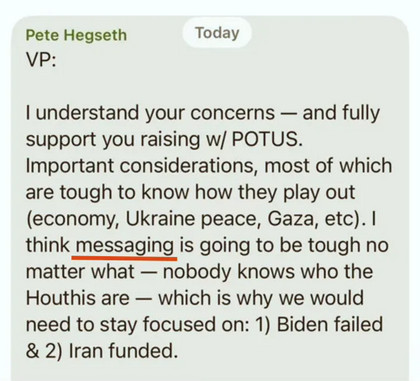 Ici, nous voyons Hegseth parler des difficultés de l'administration à "faire passer le message" concernant sa prochaine campagne de bombardements au Yémen, et de la nécessité d'établir un discours public sur la façon dont (1) Biden est responsable de la situation et (2) les Houthis sont "financés par l'Iran".