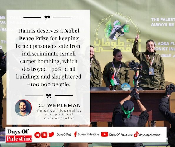 CJ Werleman, journaliste et commentateur politique américain, est allé encore plus loin. Il vient de déclarer : « Le Hamas mérite le prix Nobel de la paix pour avoir protégé les prisonniers israéliens des bombardements israéliens aveugles, qui ont détruit plus de 90 % des bâtiments et massacré plus de 100 000 personnes ».