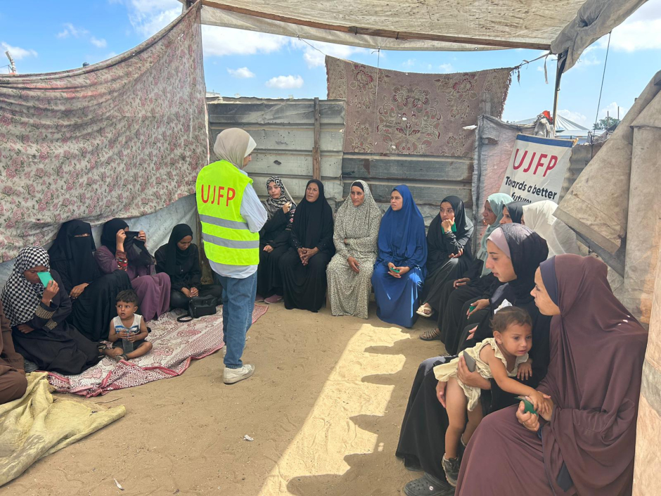 « Dans le camp Al-Irada, à l'ouest de Deir al-Balah, trente femmes déplacées se sont réunies dans une tente. Des femmes alourdies par des années de déplacement, l'amertume de la guerre, la privation et la perte de contrôle, traînant derrière elles la mémoire des conflits et des pertes successives. Pourtant, ce matin-là, elles s'assirent en cercle autour d'une équipe de l'UJFP venue leur offrir une occasion de redécouvrir l'espoir.