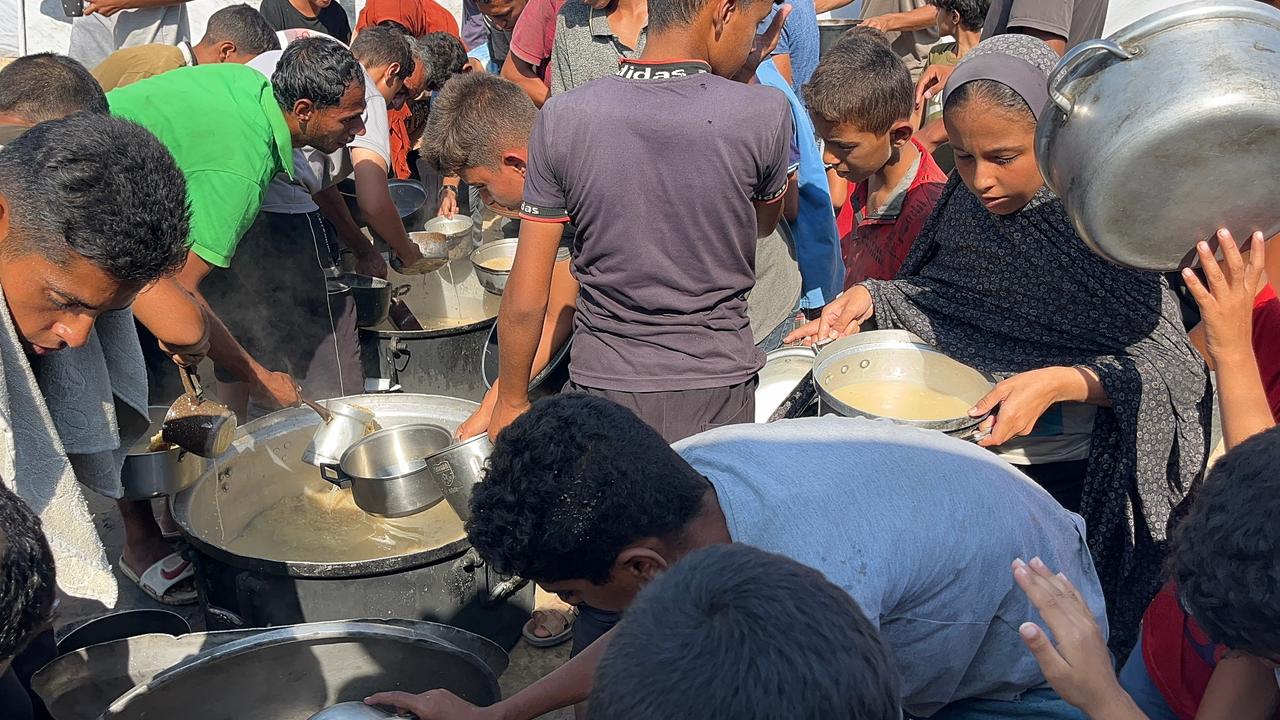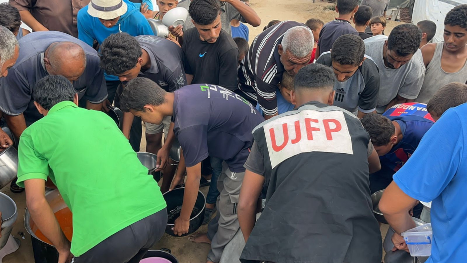 Au cœur de cette tragédie, les équipes de l'UJFP poursuivent leur travail dans Al-Mawasi de Khan Younès, où s'entassent des milliers de familles déplacées qui ont tout perdu : maisons, fermes, et même la capacité d'assurer un repas quotidien à leurs enfants. Là, les repas chauds que les équipes préparent et distribuent deviennent une véritable bouée de survie. Chaque matin, des enfants se tiennent depuis l'aube dans de longues files devant les points de distribution, les yeux emplis d'attente, posant aux membres des équipes la même question simple et douloureuse à la fois : « Qu'allez-vous cuisiner pour nous aujourd'hui ? » Une question qui révèle l'ampleur de la perte vécue par ces petits, eux qui n'ont plus de cuisine chez eux, plus de feu qui brûle, plus de table familiale qui les réunit - seulement ce que leur apportent les efforts humanitaires visant à les maintenir en vie.