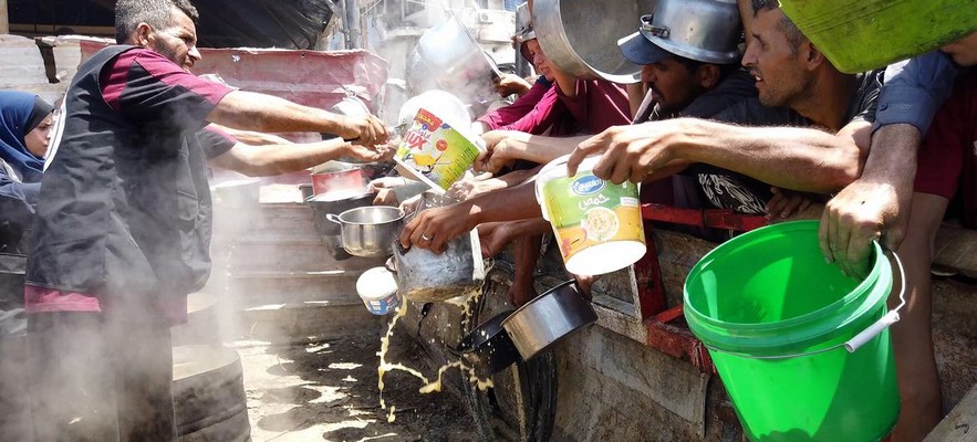 UN News. Des habitants affamés rassemblés devant une cuisine communautaire locale dans l'ouest de la ville de Gaza.
